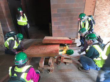 4. The Lifting and Cribbing team had to extricate an injured survivor from a simulated 200 lb wall collapse. Using a metal bar, fulcrum, and blocks of wood as cribbing successfully lifted the wall and removed the survivor.